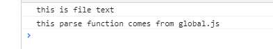const file = ‘this is file text‘; var helper = { parse: function() { console.log(‘this parse function comes from global.js‘); } }