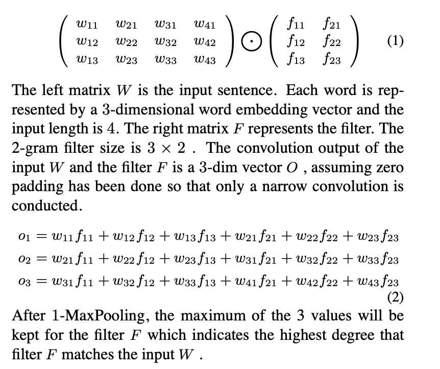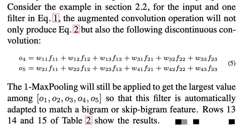 等变表示和‘k-MaxPooling’思路有关,经常和CNN联合使用。本文\(k=1\),所以CNN的每一个过滤器代表某些特征,在经过卷积操作之后,1-MaxPooling的值代表了输入包含特征的最高程度。由于卷积,这个特征在输入中的位置是不相关的。这个特性,在NLP应用中,非常有用。