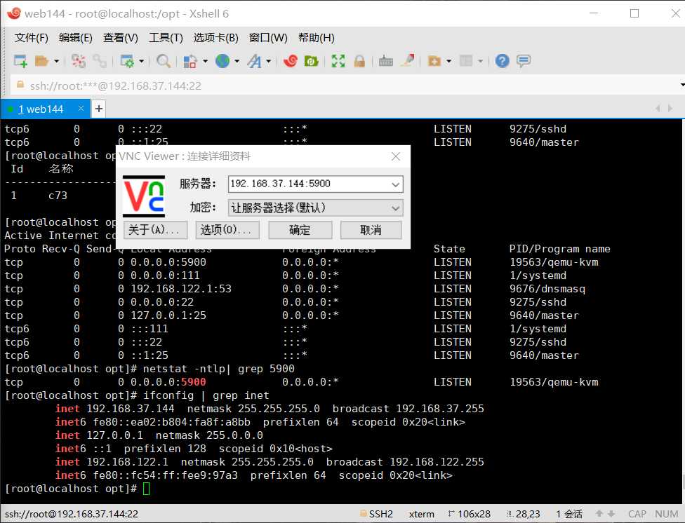 注意:如果查看5900端口开启,但是VNC无法连接KVM虚拟机时,看下防火墙是否开启。创建的虚机用VNC连接时从默认端口5900开始,即虚机一:192.168.37.144:5900 虚机二:192.168.37.144:5901