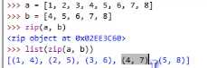 zip a=[1,2,3,4,5,6] b=[1,2,3] >>>list (zip(a,b)) [(1,1),(2,2),(3,3)]