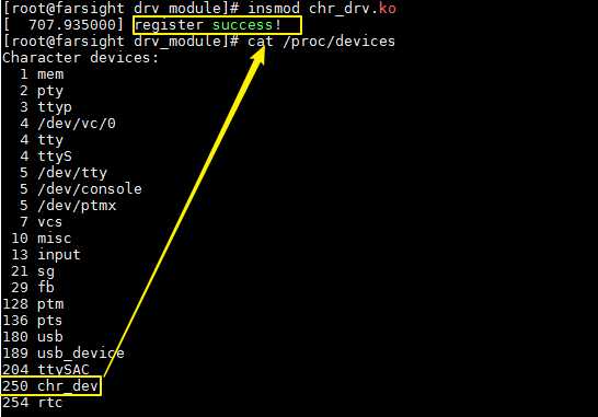 int register_chrdev(unsigned int major, const char * name, const struct file_operations * fops) //参数: //1、major:主设备号 // 设备号(32bit–dev_t)==主设备号(高12bit) + 次设备号(低20bit) // 主设备号:表示一类设备—(如:camera) // 次设备号: 表示一类设备中某一个—(如:前置camera/后置camera) // 0 -->动态分配 ; 250 --> 给定整数,静态指定 //2、name: 描述设备信息,可自定义 // 在目录/proc/devices列举出了所有的已经注册的设备 //3、fops: 文件操作对象 // 提供open, read,write //返回值:成功-0,失败-负数