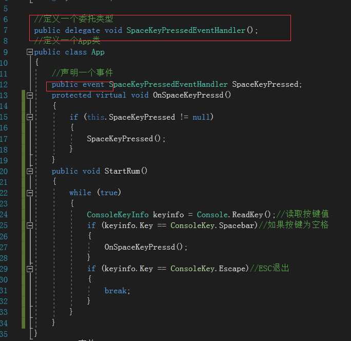 要在类中声明事件,首先要定义用来作为事件封装类型的委托,用event关键字来声明事件。为了允许派生类重写引发事件的代码,通常会在类中声明一个受保护的方法,习惯上