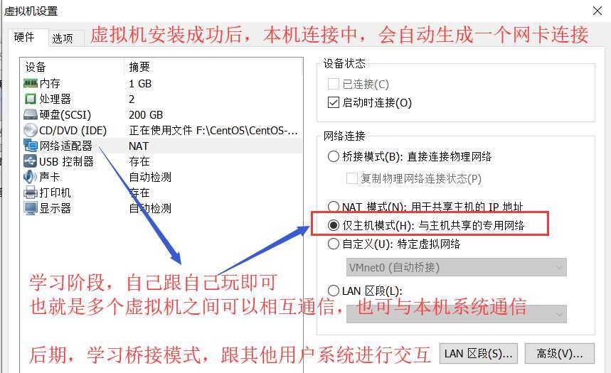 12、选择“网络适配器”进入网络配置,建议新手学习阶段,选择“仅主机模式”