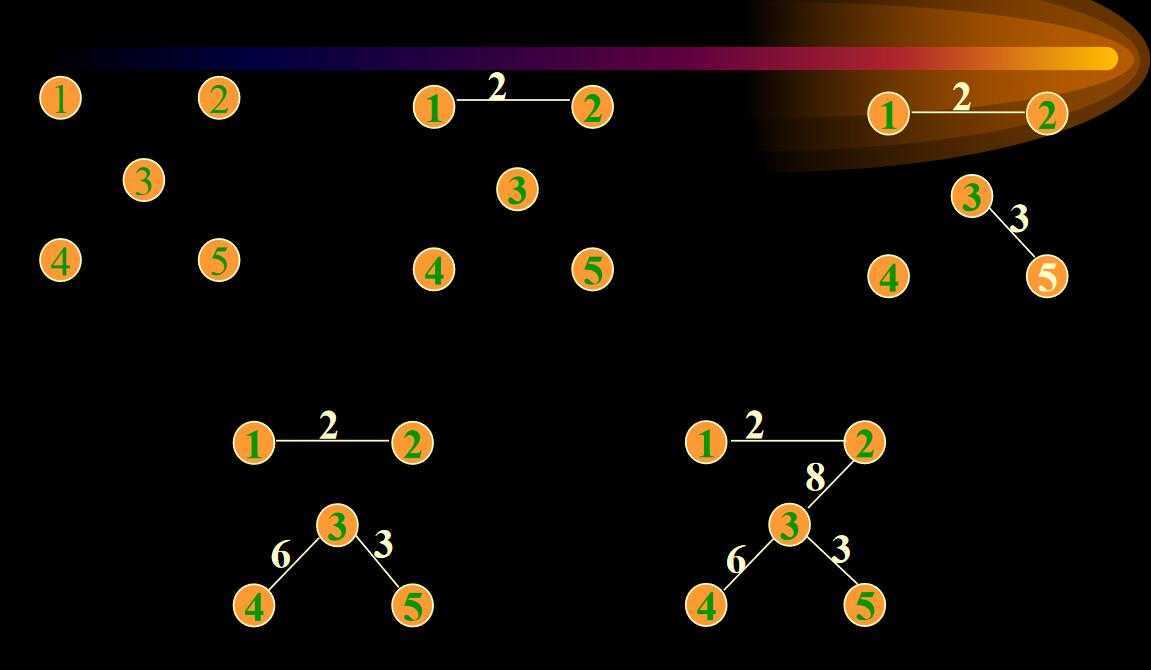 - 在Lowcost[]中选择nearvex[i]!=-1,且lowcost[i] 最小的边用v标记它,则选中的权值最小的边为(nearvex[v],v), 相应的权值为lowcost[v]。