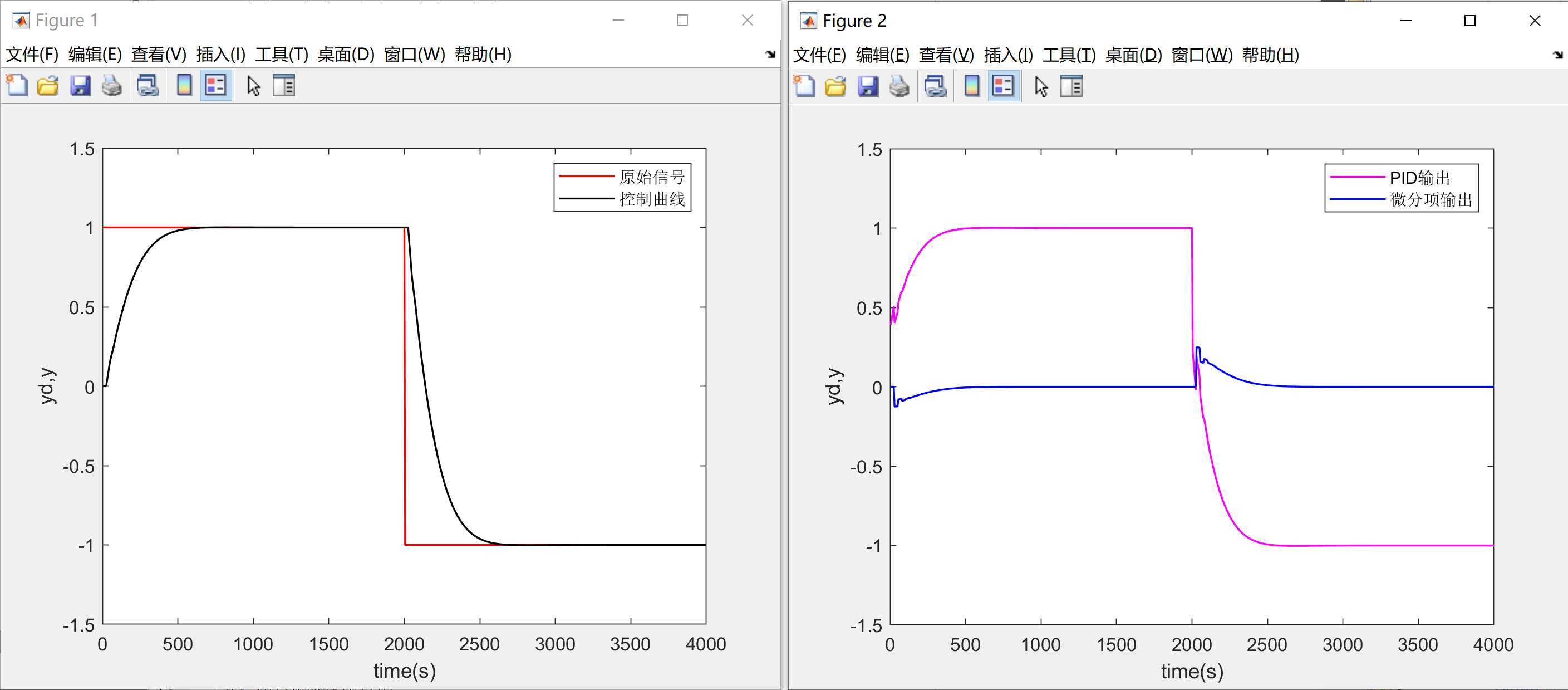 将图像2放大来看,在阶跃信号刚产生时,微分项会给整个输出带来巨大的尖峰: