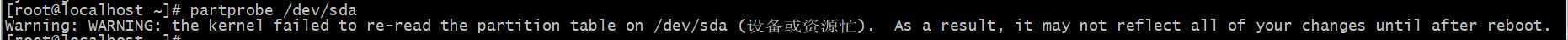 # partx -a /dev/sda #获得新分区表(通过命令partx -a /dev/sda,重新获得分区表,这个还挺好使的)