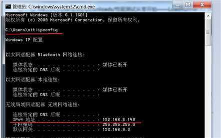 2、打开“运行”,输入"cmd",打开运行面板,输入“ipconfig”,找到IP地址,例如是:192.168.8.149
