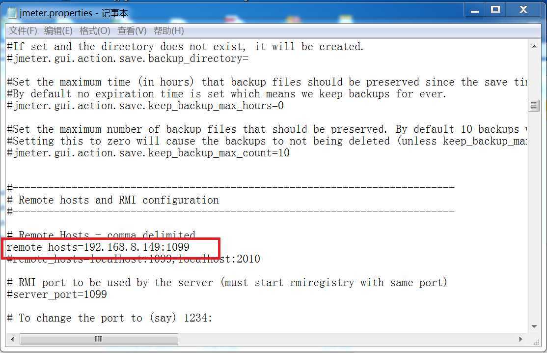 3、打开Jmeter/bin/jmeter.properties,找到”remote_hosts=127.0.0.1”,把这一行修改为”remote_hosts=192.168.8.149:1099,192.168.8.174:1099,1099是端口号,可以随意自定义。如果有多台代理机,这里需要把所有的代理机的IP地址和端口号都加入进来。