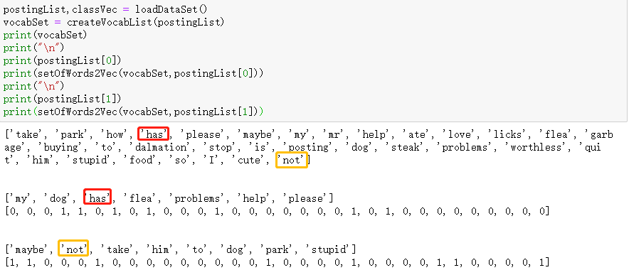 createVocabList函数的作用是通过set方法已经取并集的方式返回一个包含文本中所有出现的不重复词的集合;setOfWords2Vec函数的输入参数为词汇表和某个文本,输出的是文本向量,向量的元素包括1或0,分别表示词汇表中的单词是否出现在输入的文本中,思路是首先创建一个同词汇表等长的向量,并将其元素都设置为0,然后遍历输入文本的单词,若词汇表中出现了本文的单词,则将其对应位置上的0置换为1。
