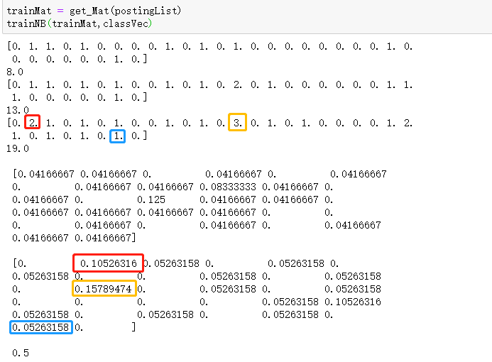 这里打印出属于侮辱性的词条,当不同词条出现同一词语时,会在词条向量的同一位置上累加,最后每一个词语出现的次数除以总数就得到了相应的概率,例如出现两次—>0.105、出现三次—>0.157、出现一次—>0.052。