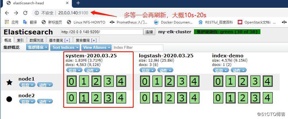 随之打开浏览器输入http://20.0.0.140:9100/ 查看索引信息