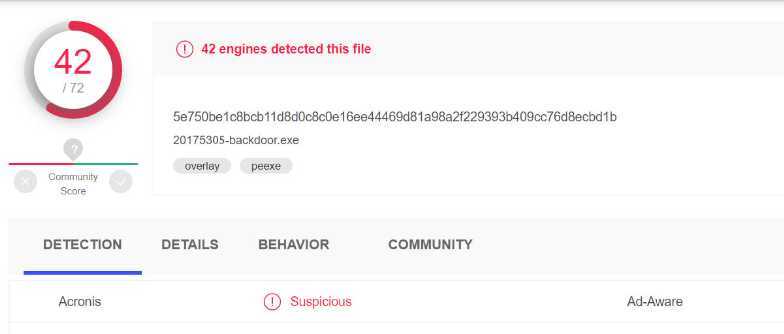 i686-w64-mingw32-g++ 20175305-backdoor.c -o 20175305-backdoor.exe编译为可执行文件用virustotal检测结果如下: