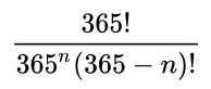 因此,所有人的生日都不相同的概率,就是下面的公式。
