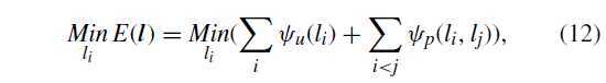 \(l_i\) 做像素 i 的标签,基于 mean field approximation 最小化能量函数来做像素级标记