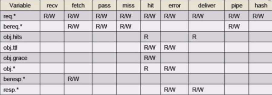 了解了上面的状态引擎,我们在说一说varnish的变量,在前文我们大概说了下varnish的变量大概可以分5类,一类是客户端请求报文相关的,req.*;一类是varnish服务器请求后端服务器报文,bereq.*;一类是后端服务器响应varnish服务器的beresp.*;一类是varnish服务器响应客户端的resp.*;还有一类是obj.*,这类变量主要是储存缓存空间中的缓存对象的属性;结合上面说的状态引擎,不难里接在不同的状态引擎里,对应变量是有限的,比如bereq.*这类变量就不能用于vcl_recv,因为vcl_recv是接收用户请求相关的,而bereq.* 是varnish请求后端服务器的变量,这两者很明显是不再一个级别的,所以通常不同类的变量对应能够用于哪些状态引擎中是有限制的;而对应变量的属性也是有要求的,比如obj.hit这个变量是存储缓存项命中次数的,通常可用在vcl_hit和vcl_deliver状态引擎中,表示应用缓存命中次数,相对于这个变量来说,我们是不能修改的,所以obj.hits这个变量在vcl_hit和vcl_deliver状态引擎中只可读,不可修改;而对于obj.ttl这个值就不一样了;obj.ttl记录缓存项可缓存的时间;很显然obj.ttl这个变量只能用于可缓存的状态引擎上,比如vcl_hit,对于告诉客户端可缓存的时间,很明显它不能是一个不可修改的值;所以对于obj.ttl这个变量在vcl_hit状态引擎中就具有可读可写权限(即我们可以修改该变量的值);说这么多无外乎就是表达一个意思,不同类型的变量受限状态引擎,不同变量在不同的状态引擎上不是都可读可写,有的变量只可读;如下图