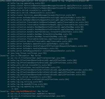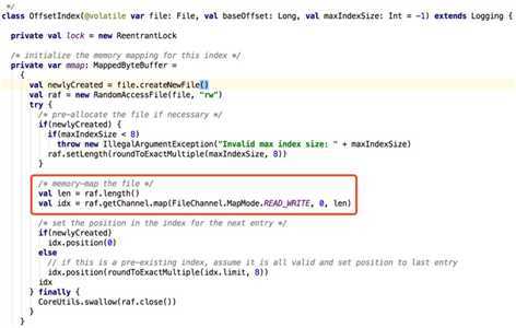 Kafka服务使用scala语言开发,运行与jvm平台上,因为jvm heap是预分配的内存,所以占用虚拟虚拟内存区域很少。在Kafka程序中占用最大是做文件映射(调用mmap函数),Kafka中存储分为数据文件和索引文件,数据文件直接读写不进行mmap映射,而索引文件为了加快读写速度就实现了mmap映射机制,每创建一个索引文件做一次虚拟内存映射,map_count数量就加1,直到当前map_count > 系统 max_map_count,就会抛出OutofMemoryError,接着java进程退出了。下面是索引文件做映射的代码