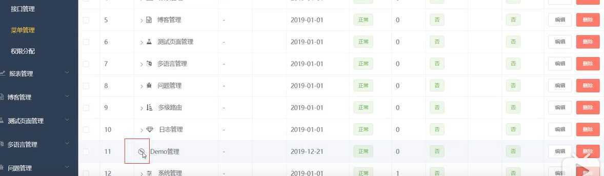菜单管理,注意:删除不是一个页面。我们当做按钮来处理
