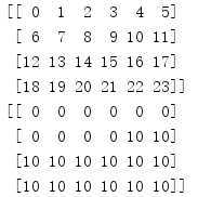 # coding=utf-8 import numpy as np t = np.arange(24).reshape((4,6)) print(t) print(t<10) t[t<10] = 0 print(t)