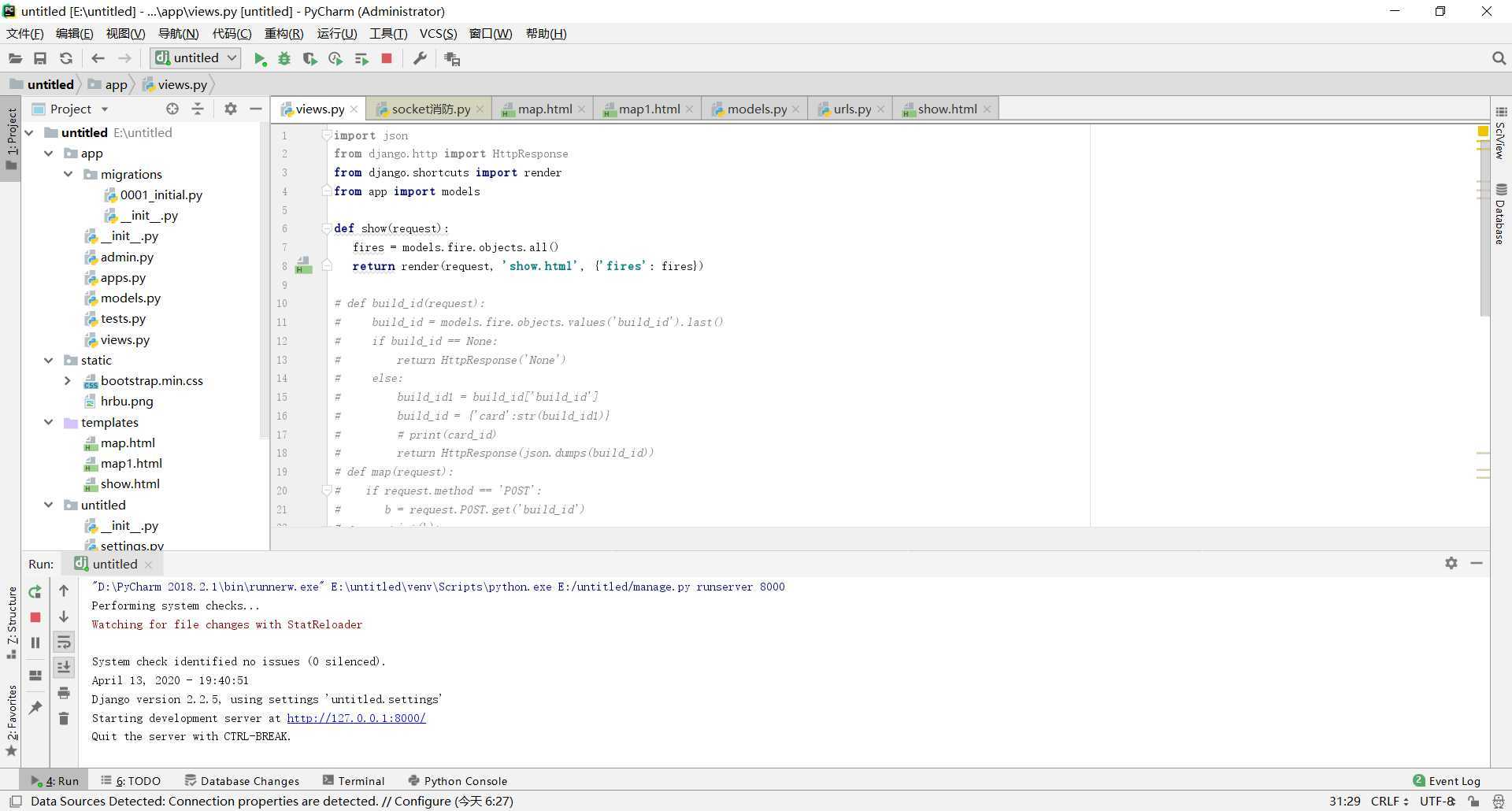 数据库录入完毕接下来我们启动我们的django来运行我们代码