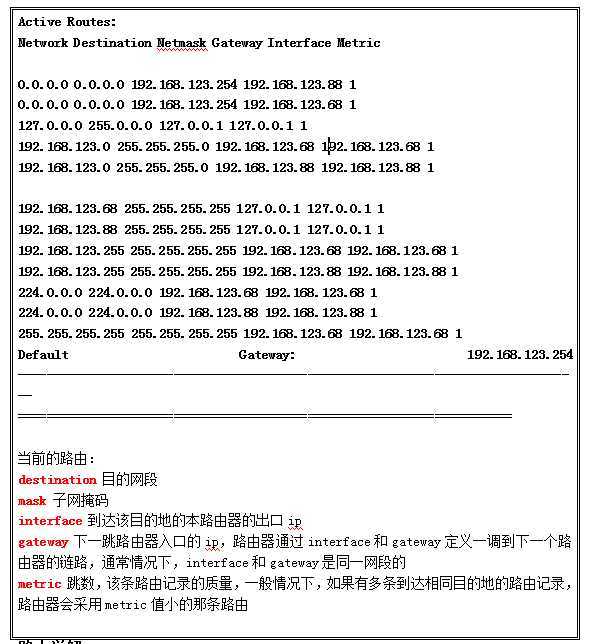 该路由记录的意思是:当我接收到一个数据包的目的网段不在我的路由记录中,我会将该数据包通过192.168.123.68这个接口发送到192.168.123.254这个地址,这个地址是下一个路由器的一个接口,这样这个数据包就可以交付给下一个路由器处理,与我无关。该路由记录的线路质量