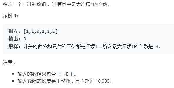 1 class Solution(object): 2 def findMaxConsecutiveOnes(self, nums): 3 """ 4 :type nums: List[int] 5 :rtype: int 6 """ 7 count = 1 if nums[0] == 1 else 0 8 ans = [] 9 if len(nums) == 1: 10 ans.append(count) 11 for i in range(1, len(nums)): 12 if nums[i] == 1: 13 count += 1 14 elif nums[i - 1] == 1 and nums[i] != 1: 15 ans.append(count) 16 count = 0 17 if i == len(nums) - 1: 18 ans.append(count) 19 return max(ans) 20 21 22 if __name__ == ‘__main__‘: 23 solution = Solution() 24 print(solution.findMaxConsecutiveOnes([1, 1, 0, 1, 1, 1]))