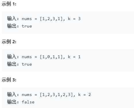 1 class Solution(object): 2 def containsNearbyDuplicate3(self, nums, k): 3 arr = {} 4 for i in range(len(nums)): 5 if nums[i] in arr and i - arr[nums[i]] <= k: 6 return True 7 arr[nums[i]] = i 8 return False