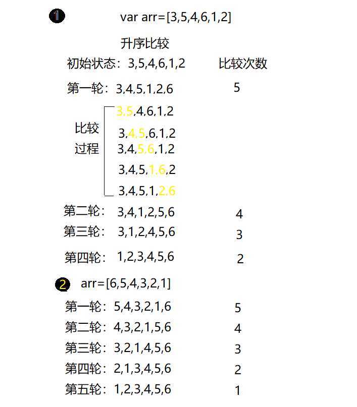 //冒泡排序 升序 var arr=[3,5,4,6,1,2] //比较轮数 for(var i=0;i<arr.length-1;i++){ //每轮比较次数 for(var j=0;j<arr.length-1-i;j++){ if(arr[j]>arr[j+1]){ if(arr[j]>arr[j+1]){ //借助第三方变量temp交换两个变量的值 var temp=arr[j];//当前值 //通过比较相邻位置互换 arr[j]=arr[j+1];//把后一位值向前移一位 arr[j+1]=temp;//把当前一位值向后移一位 } } }