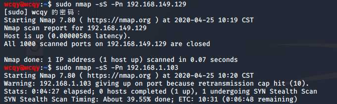 使用nmap -sS -Pn 192.168.1.103进行Nmap端口扫描,-sS是TCP SYN扫描,-Pn是在扫描之前,不发送ICMP echo请求测试目标