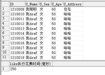 declare @q datetime set @q = getdate() select ID,U_Name,U_Sex,U_Age,U_Address from test1 where U_Name like ‘我%‘ select [like执行花费时间(毫秒)]=datediff(ms,@q,getdate())
