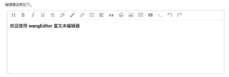 <!DOCTYPE html> <html> <head> <meta charset="UTF-8"> <title>wangEditor demo</title> </head> <body> <div id="editor"> <p>欢迎使用 <b>wangEditor</b> 富文本编辑器</p> </div> <!-- 注意, 只需要引用 JS,无需引用任何 CSS !!!--> <script type="text/javascript" src="/wangEditor.min.js"></script> <script type="text/javascript"> var E = window.wangEditor var editor = new E(‘#editor‘) // 或者 var editor = new E( document.getElementById(‘editor‘) ) editor.create() </script> </body> </html>