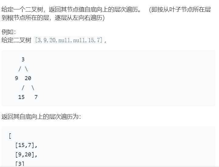 1 /** 2 * Definition for a binary tree node. 3 * struct TreeNode { 4 * int val; 5 * TreeNode *left; 6 * TreeNode *right; 7 * TreeNode(int x) : val(x), left(NULL), right(NULL) {} 8 * }; 9 */ 10 class Solution { 11 public: 12 vector<vector<int>> levelOrderBottom(TreeNode* root) 13 { 14 vector< vector<int> > result; 15 if (root == NULL) 16 return result; 17 18 queue<TreeNode*> q; 19 q.push(root); 20 21 int count = 1; 22 int level = 0; 23 24 vector<int> tmp(0); 25 while(!q.empty()) 26 { 27 tmp.clear(); 28 level = 0; 29 30 for (int i = 0; i < count; ++i) 31 { 32 root = q.front(); 33 q.pop(); 34 tmp.push_back(root->val); 35 36 if (root->left != NULL) 37 { 38 q.push(root->left); 39 ++level; 40 } 41 if (root->right != NULL) 42 { 43 q.push(root->right); 44 ++level; 45 } 46 } 47 48 count = level; 49 result.push_back(tmp); 50 } 51 reverse(result.begin(), result.end()); 52 return result; 53 54 } 55 };