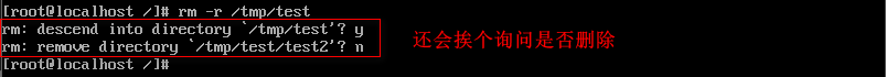 使用 -r 可以删除目录,但是若删除的目录下含有文件或目录时,还会询问是否删除目录下的内容。
