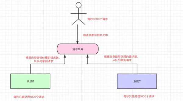 系统B和系统C根据自己的能够处理的请求数去消息队列中拿数据,这样即便有每秒有8000个请求,那只是把请求放在消息队列中,去拿消息队列的消息由系统自己去控制,这样就不会把整个系统给搞崩。