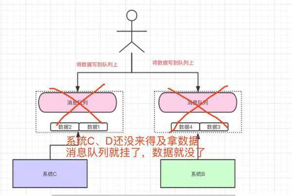 我们将数据写到消息队列上,系统B和C还没来得及取消息队列的数据,就挂掉了。如果没有做任何的措施,我们的数据就丢了。