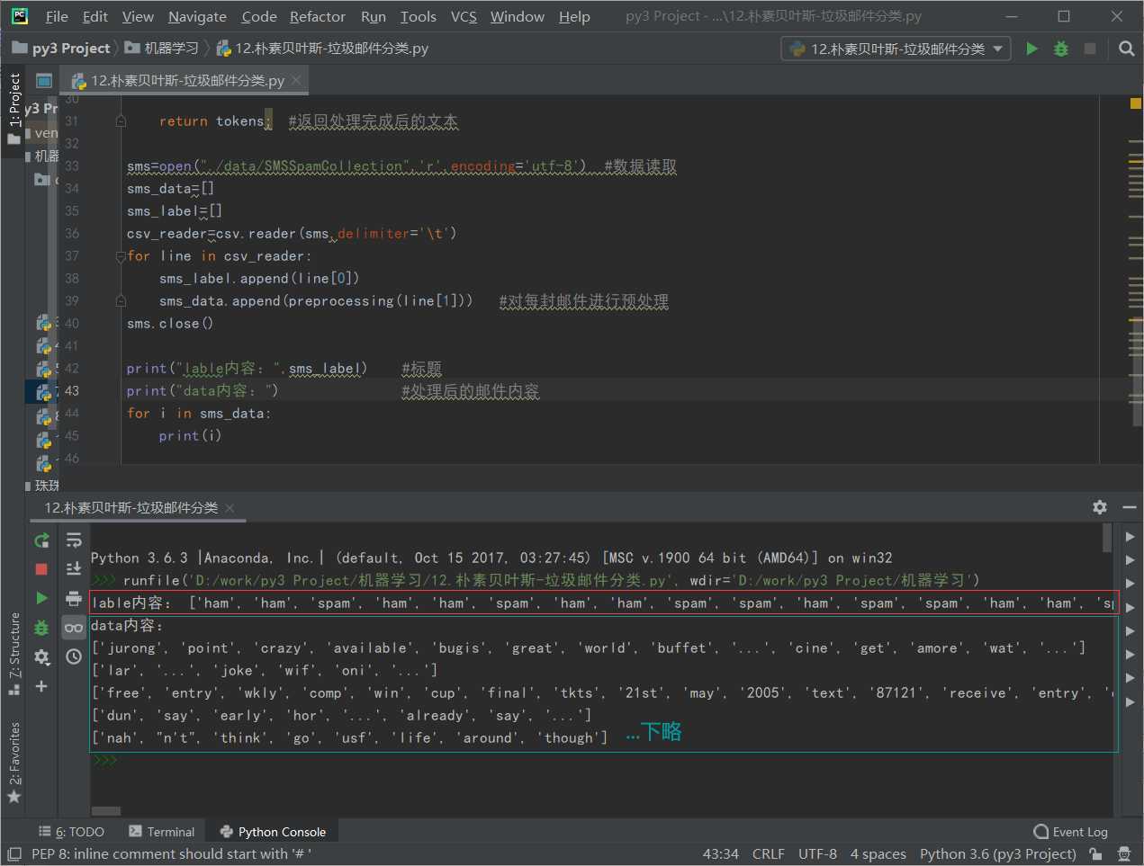sms_data.append(preprocessing(line[1])) #对每封邮件做预处理