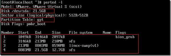 Centos7正常安装完成之后,在系统中查看磁盘分区格式,如下图