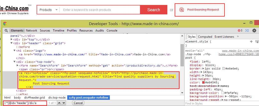 实用场景3:ctrl+f,在搜索框中写元素的xpath路径,如果elements元素行被选中表示路径写的正确,如下例子定位post sourcing request按钮位置: