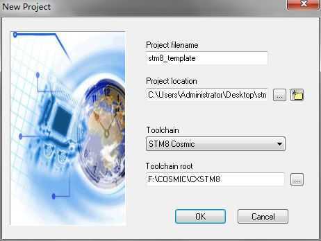 4)接下来再次填入工程名称,无需再次设置路径,在Toolchain下拉选项中选择STM8 Cosmic,初次使用STVD需要设置Cosmic的路径,为Cosmic安装目录下的CXSTM8文件夹,点击OK;