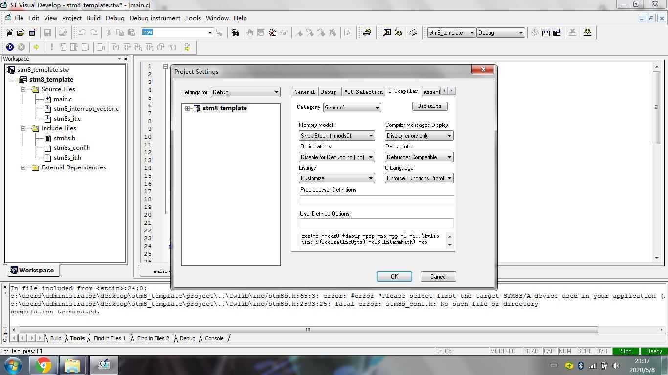 7)此时不要着急写程序,我们右键单击左侧的stm8_template,选择settings,在弹出的对话框中选择C Compiler子项;
