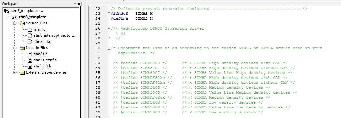 仔细阅读注释我们可以发现,如果不在settings里进行设置,也可以在stm8s.h中将对应型号的注释取消,也可完成对应型号的预定义设置;