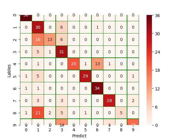 score = model.evaluate(X_test, y_test) print(‘score:‘, score) y_pred = model.predict_classes(X_test) print(‘y_pred:‘, y_pred[:10]) # 交叉表与交叉矩阵 y_test1 = np.argmax(y_test, axis=1).reshape(-1) y_true = np.array(y_test1)[0] pd.crosstab(y_true, y_pred, rownames=[‘true‘], colnames=[‘predict‘]) # seaborn.heatmap y_test1 = y_test1.tolist()[0] a = pd.crosstab(np.array(y_test1), y_pred, rownames=[‘Lables‘], colnames=[‘Predict‘]) df = pd.DataFrame(a) sns.heatmap(df, annot=True, cmap="Reds", linewidths=0.2, linecolor=‘G‘) plt.show()