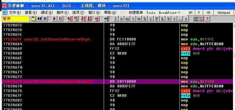 所以该ActivateKeyboardLayout函数的实际地址为 77D10000+18673=77D28673