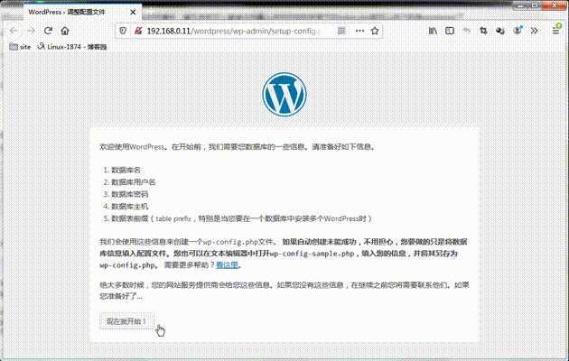提示:我们把wordpress程序放到我们预先搭建好的LNMP环境中,接下来就可以直接浏览器上访问对应的目录下的index.php就可以进行安装wordpress了