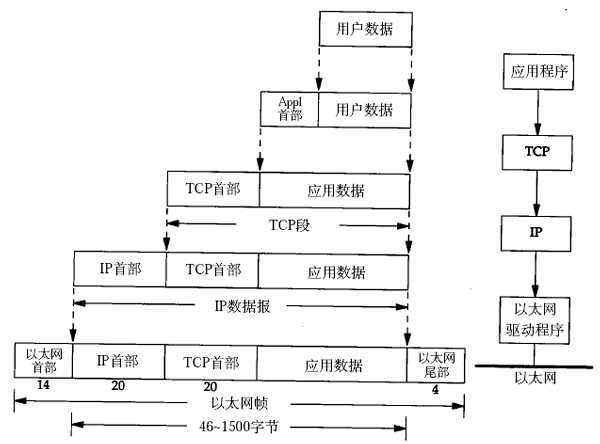 传输层及其以下的机制由内核提供,应用层由用户进程提供(后面将介绍如何使用socket API编写应用程序),应用程序对通讯数据的含义进行解释,而传输层及其以下处理通讯的细节,将数据从一台计算机通过一定的路径发送到另一台计算机。应用层数据通过协议栈发到网络上时,每层协议都要加上一个数据首部(header),称为封装(Encapsulation),如下图所示: