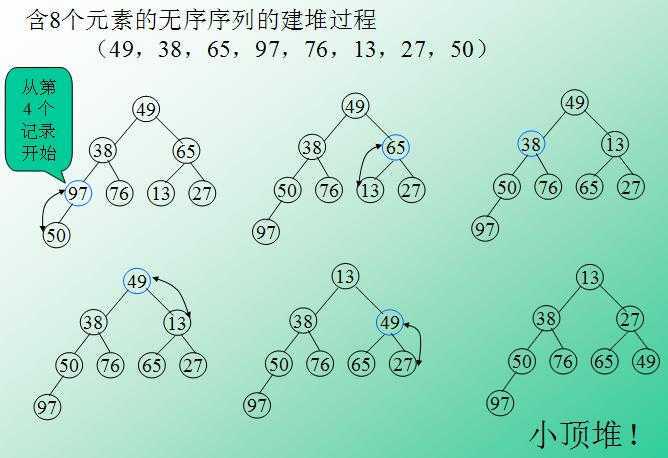 2、用数组$arr建立一个小顶堆(主要步骤,会在代码注释里解释,下图是用一个数组建立小顶堆的过程);