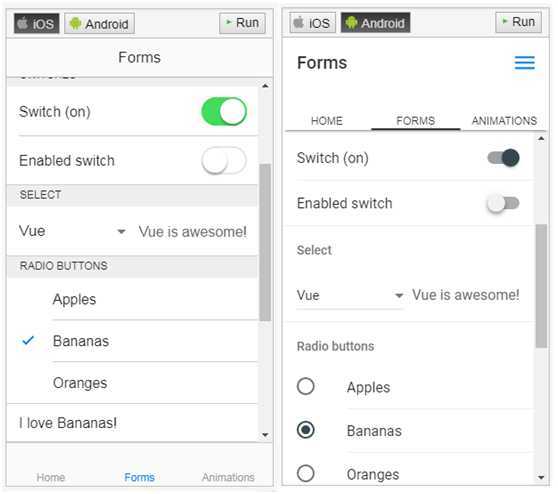 从上图可以看出,桌面版本比移动版本更紧凑,控件风格跟所在平台近似。支持三种主题:ios、 md、 aurora对应不同平台。