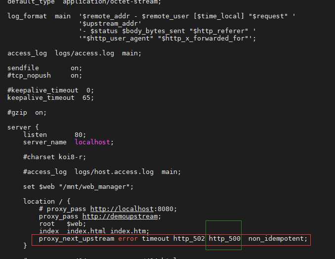 根据前面了解到有failover是由于配置了proxy_next_upstream,所以我把proxy_next_upstream后面的http_500去掉了。