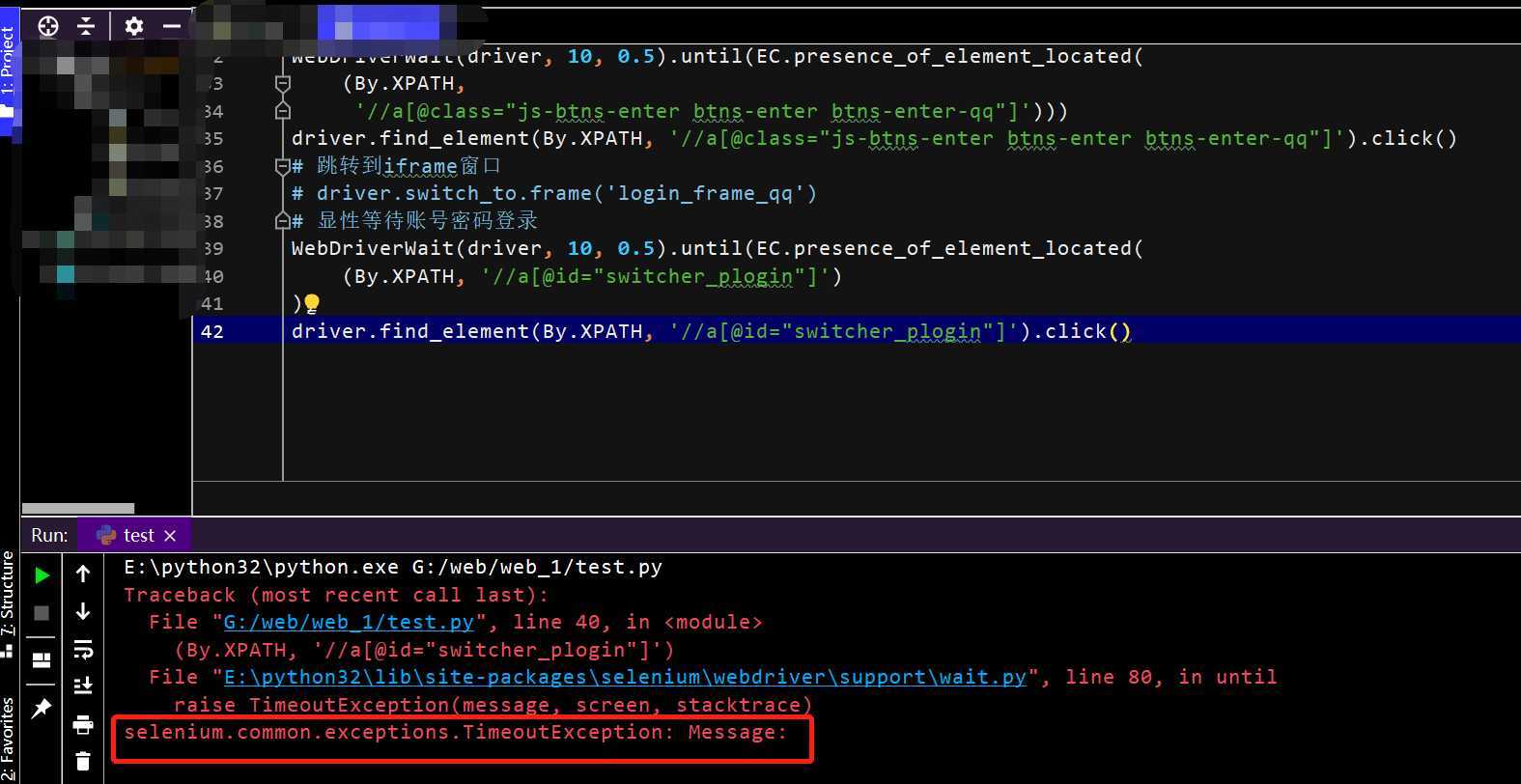 from selenium import webdriver from selenium.webdriver.common.by import By from selenium.webdriver.support import expected_conditions as EC from selenium.webdriver.support.wait import WebDriverWait from selenium.webdriver.common.keys import Keys driver = webdriver.Chrome() driver.get("http://www.baidu.com") driver.find_element(By.ID, "kw").send_keys("腾讯课堂") driver.find_element(By.ID, "kw").send_keys(Keys.ENTER) loc = (By.XPATH, ‘//div[@id="1"]//h3[@class="t"]//em‘) WebDriverWait(driver, 10, 0.5).until(EC.presence_of_element_located(loc)) driver.find_element(*loc).click() windows = driver.window_handles # 获取该会话所有的句柄 driver.switch_to.window(windows[-1]) # 跳转到最新的句柄 first_login = (By.XPATH, ‘//a[@class="mod-header__link-login js-login-op"]‘) # 腾讯课堂首页登录按钮 WebDriverWait(driver, 10, 0.5).until(EC.presence_of_element_located(first_login)) # 显性等待到登录按钮加载出来,没隔0.5检查一共10秒 # 显性等待首页中的登录按钮是否存在 WebDriverWait(driver, 10, 0.5).until(EC.presence_of_element_located(first_login)) # 点击登录按钮 driver.find_element(*first_login).click() # 显性等待用qq登录是否存在 WebDriverWait(driver, 10, 0.5).until(EC.presence_of_element_located( (By.XPATH, ‘//a[@class="js-btns-enter btns-enter btns-enter-qq"]‘))) driver.find_element(By.XPATH, ‘//a[@class="js-btns-enter btns-enter btns-enter-qq"]‘).click() # 跳转到iframe窗口 driver.switch_to.frame(‘login_frame_qq‘) # 显性等待账号密码登录 WebDriverWait(driver, 10, 0.5).until(EC.presence_of_element_located( (By.XPATH, ‘//a[@id="switcher_plogin"]‘) )) driver.find_element(By.XPATH, ‘//a[@id="switcher_plogin"]‘).click()